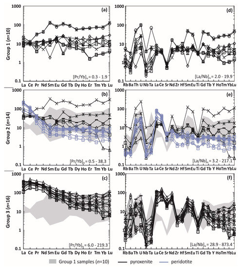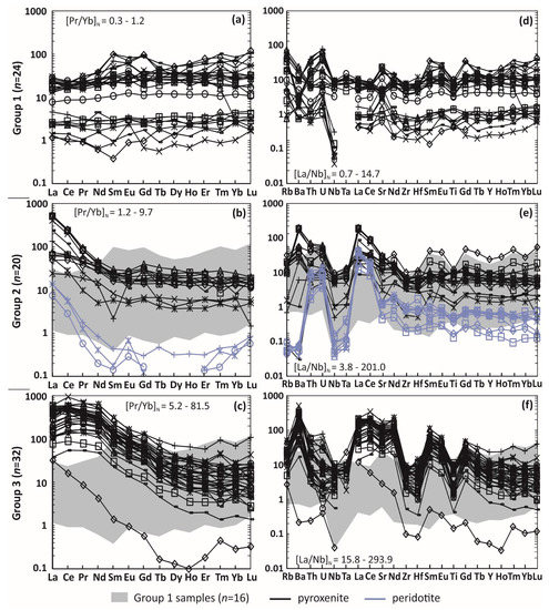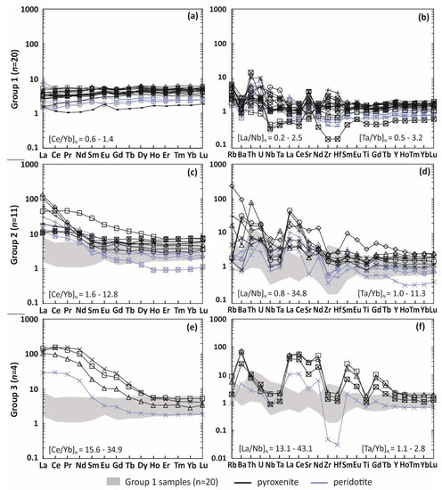 Chondrite-normalised Rare Earth Elements (REE) plots and primitive mantle-normalised trace-element plots for the group 1 (a,b), group 2 (c,d) and group 3 (e,f) ultramafic rocks from the Ben Strome Complex. Normalised values from McDonough and Sun [88]. Note scale change on (f).