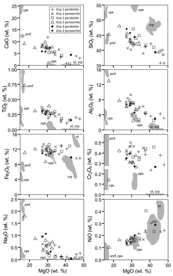 The three geochemical groups cannot be distinguished by major-element geochemistry, with major-element bivariate plots (Figure 5) demonstrating that MgO in the Ben Strome ultramafic rocks displays moderate negative correlations with SiO2, TiO2, Al2O3, CaO and Na2O, a moderate positive correlation with NiO (R2 = 0.5–0.6), and no correlation with Fe2O3 or Cr2O3 (R2 ≤ 0.1). These plots (Figure 5) also include the compositional ranges of silicate minerals from the Ben Strome Complex, demonstrating that the bulk-rock major-element compositions of the analysed rocks are essentially a function of modal mineral abundances. The major-element data are presented on a volatile-free basis in Figure 5, with summaries of each geochemical group included in Table 2 and the full dataset available in the Supplementary Material (Table S1).