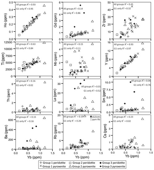 As shown by trace-element bivariate plots (Figure 6), Yb (a relatively immobile trace-element) displays strong positive correlations with Ho, Y and Ti (R2 ≥ 0.6), moderate positive correlations with Zr (R2 = 0.45), weak correlations with Nb, Th, Gd, Rb, Cs and Ba (R2 = 0.1–0.3) and no correlation with La and Sm (R2 ≤ 0.1) in the Ben Strome ultramafic rocks collectively. Although the relationship between Yb and other trace-elements in the group 1 samples is generally comparable to the other geochemical groups (Figure 6), these samples display a moderate to strong correlation between Yb and the LREE (Figure 6; R2 = 0.5–0.8).