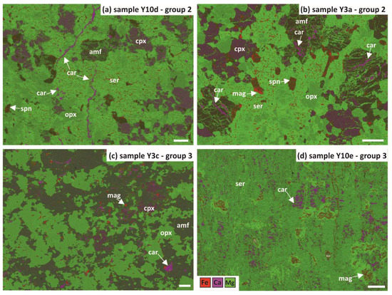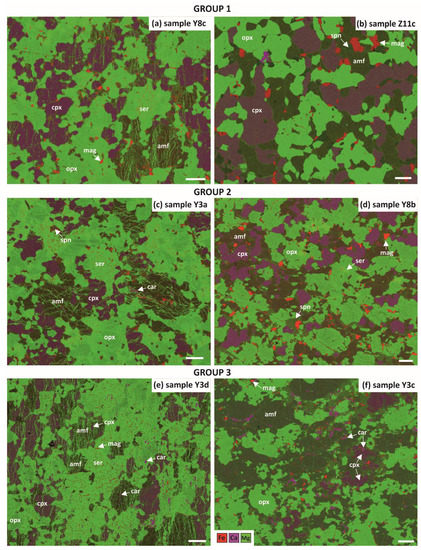 Element maps detailing the petrographic and textural characteristics of the Ben Strome ultramafics. (a,b) group 1 samples; (c,d) group 2 samples; (e,f) group 3 samples. Note the comparable textures between the geochemical groups. White scale bar = 1 mm. Abbreviations: amf = amphibole; car = carbonate phases; cpx = clinopyroxene; mag = magnetite; opx = orthopyroxene; ser = serpentine; spn = spinel.