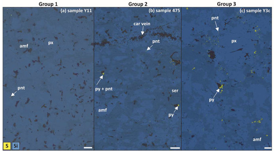 Element maps detailing the mineralogical and textural associations of the sulphide minerals. Note: black areas represent both oxide and carbonate mineral phases. White scale bar = 1 mm. Abbreviations: amf = amphibole; car = carbonate phase; pnt = pentlandite; px = pyroxene; py = pyrite; ser = serpentine.