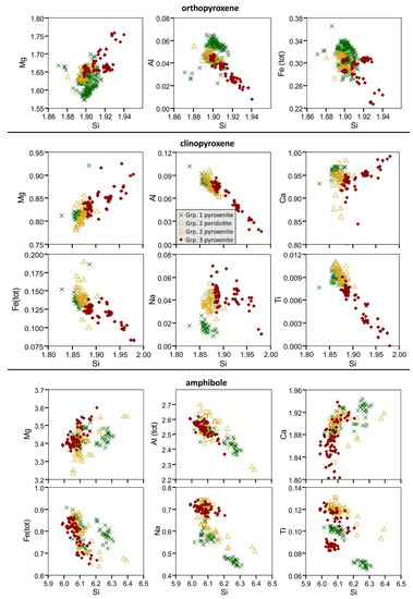 Orthopyroxenes classify as Al-rich hypersthene and exhibit the following compositional ranges: Wo = 0.2–5.0, En = 79.9–87.9; Fs = 11.9–18.8 and 1.7–4.2 wt. % Al2O3. On bivariate plots (Figure 10), group 1 and 2 orthopyroxenes collectively form relatively tight clusters (Figure 10), with restricted Si, Mg, Al, Ca and Fe ranges (Figure 10). Group 3 orthopyroxene compositions are broadly comparable to groups 1 and 2, although they exhibit minor Si and Mg enrichment and minor Al depletion (Figure 10).
