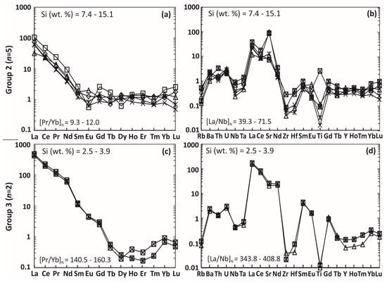 Chondrite-normalised REE (a,c) and primitive mantle-normalised [88] trace-element plots (b,d) for group 2 (a,b) and group 3 (c,d) carbonate grains. Note: due to the small size of carbonate grains, laser ablation (LA)-ICP-MS analyses include variable proportions of silicate material, as indicated.