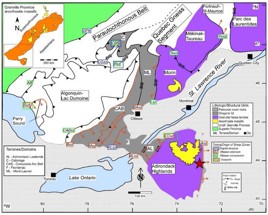Generalized geologic and tectonic map of the southern Grenville Province (modified from Rivers, T. Can. J. of Earth Sci. 2012 [24]). Black and red lines show major terrain/domain/structural boundaries. Major shear zones are shown by age, tectonic affiliation, and movement history. Shear zones include: Abt: Allochthon boundary thrust, Bsz: Bancroft, BAsz: Baskatong, BLsz: Black Lake, CABsz: Composite Arc Boundary, CBt: Cabonga thrust, CCsz: Carthage-Colton, CGsz: Cagecrib, EAsz: Eastern Adirondack, GFtz: Grenville Front tectonic zone, Lsz: Labelle, Msz: Mooroton, RLsz: Robertson Lake, Rsz: Renzy, Ssz: Shawanaga, Tasz: Taureau, and Twsz: Tawachiche. Inset shows location of Figure 2 (red box), the southern Grenville Province (orange), and major anorthosite massifs (yellow).