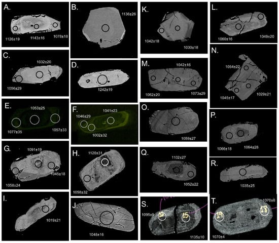 Geochronology. U-Pb zircon geochronology was carried out at the Arizona Laserchron Center, University of Arizona. Zircons are shown in Figure 6. U-Pb analytical results are shown in Figure 7 and in summary form in Table 2. Supplemental Files S1–S6 contain the raw data. Analyses by LA-MC-ICP-MS were conducted as previously described [56]. Ablation of zircon grains embedded in epoxy and sectioned 1/3 of the distance through was done with a Photon Machines Analyte G2 DUV193 Excimer laser using spot diameters of 30 microns with a fluence of ~4 J/cm2 and frequency of 4 Hz. The ablated material was carried with helium-argon gas (flow rate 0.2–0.36 L/min) into the plasma source of a Nu Instruments HR ICPMS equipped with a flight tube of sufficient width that U, Th, and Pb isotopes can be measured simultaneously. All measurements were made in a static mode using Faraday detectors for 238U, 232Th, and 208-206Pb, and discrete dynode ion-counters for 204Pb and 202Hg. Ion yields are typically ~1 mv per ppm. Each analysis consists of one 15 s integration on peaks with the laser off (for backgrounds), fifteen 1-s integrations with the laser firing, and a 30 s delay to purge the previous sample and prepare for the next analysis. The ablation pit is ~4–15 microns in depth.