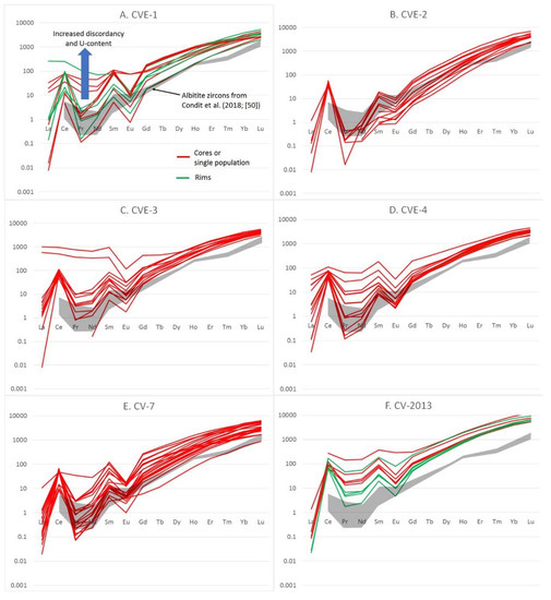 Chondrite-normalized rare earth element diagrams for the samples analyzed in this study. (A) CVE-1, (B) CVE-2, (C) CVE-3, (D) CVE-4, (E) CV-7, and (F) CV-2013. Thick black line shows average values from Table 3. Red lines indicate analyses from the center of homogeneous grain populations or older populations of grains interpreted as xenocrysts. The green lines are from rims when cores and rims could be readily distinguished. Grey shading represents zircons from albitites from the Big Sky Orogen (Condit et al., 2018 [48]).