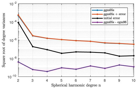 In Figure 1, the original (true) gravity field (GGM05S), which is used to produce the observations and the disturbed field, which is used as initial guess in the estimation process and the difference between both gravity fields are shown. All gravity fields are shown in the form of square root of degree variances. Additionally, for comparison, the difference between GGM05S and Earth Gravitational Model 1996 (EGM96) [18] is also plotted. This shows that the imposed initial gravity field error is quite big.