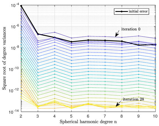 To recover the gravity field, we use four days of simulated data and a local arc length of one day. The perfect initial states for each arc are used. The difference between the estimated gravity field after each iteration with respect to the true field is shown in Figure 3 for 28 iterations. While the lower degrees (2 and 3) improve with the first iteration, the higher degrees are getting a bit worse and start improving after some iterations because there is a big difference between the initial and true gravity field for the lower degrees (2 and 3). After the fifth iteration, all degrees are improving subsequently with further iterations up to a square root of degree variances of about . After this value is reached, further iterations are not improving the result anymore. Because the deviations of the spherical harmonic coefficients () have reached the order of to , which is the border of the double data type precision.