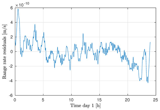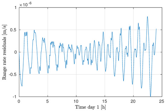 Time series of range rate residuals for Day 1 after the last (28th) iteration.