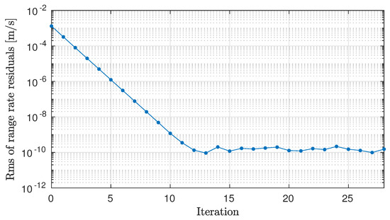 Until about Iteration 12, the resulting range rate residuals are decreasing. After Iteration 12, they stay at the same level of about some m/s. Exemplarily, the range rate residuals for Day 1, for the sixth and last iteration (Iteration 28) are shown in Figure 4 and Figure 5. The evolution of the range rate residuals over all iterations is displayed in Figure 6, also for Day 1. The root mean square (rms) of the range rate residuals is computed and plotted over all iterations. This demonstrates that the residuals do not decrease further than m/s. This is reasonable because this is about the numerical integration precision that is possible to archive for velocities (or relative velocities) with double precision data type. However, the gravity field coefficients can still be improved because, at this point, they are not limited by the integration error, but the linearization. The linearization error can be further reduced with subsequent iterations.