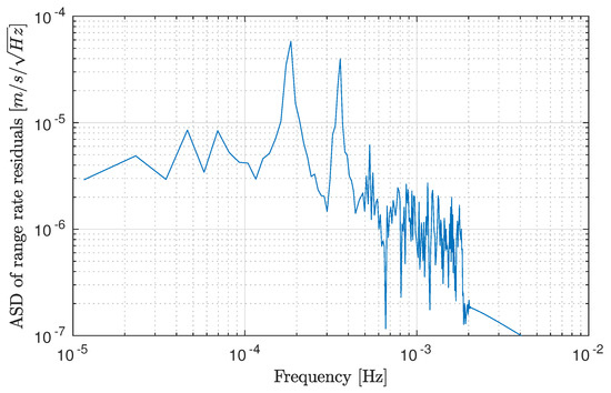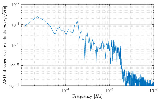 Amplitude spectral density of range rate residuals for Day 1 after the last (28th) iteration.