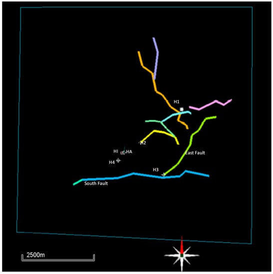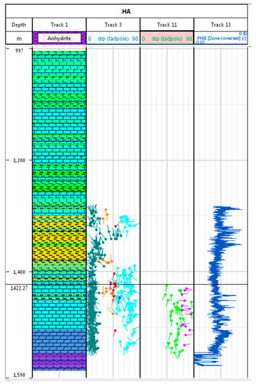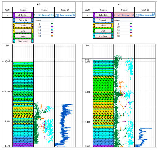 The grid and its properties (facies, porosity, and permeability distribution) for the matrix, the main horizons (Top Dogger, Top Lias, Top Calcareous Sopeña, and Top Keuper), the fault maps at Top Calcareous Sopeña and the well trajectories and logs (facies, porosity) are imported into FracaFlow™. All of the fractures characteristics for HI and HA from Televiewer log [18] were also imported as fracture logs (type, dip, and azimuth) as a function of depth from the Dogger to the well shoes (Sopeña/Keuper formations), as shown in Figure 3.