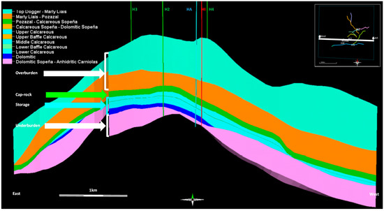 Vertical cross-section of the geological model of the Hontomìn storage complex; The HA and HI newly-drilled wells are the observation and CO2 injection wells, respectively, while H2 to H4 wells are legacy wells.