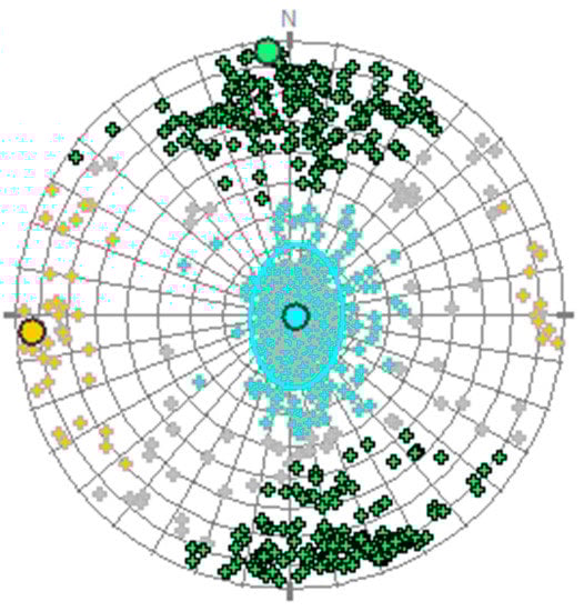 The pole analysis (Figure 4) is based on the statistical analysis of the dip and the strike of the mean pole of each set of fractures. The mean poles are analyzed according to their main orientations (dip, strike), as shown in Table 3.