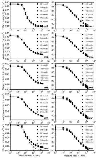 Fitted soil water retention curve parameters of the boulder marl (bm): Brooks–Corey (BC) model [18], van Genuchten (VG) model [9], Fredlund and Xing (FX) model [19], Kosugi (LN) model [20], Durner (DB) model [21], and Seki (BL) model [10].