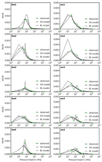 On the other hand, bm4 showed a mono- or single-peak for the observed data and the VG model between −30 hPa and −60 hPa, and a bi-or double-peak structure for the BL model SWRC with a more pronounced second peak between −60 and −150 hPa, just as mc4. Additionally, bm5 is characterised by an observed and fitted mono-peak PSD, while the observed data of mc showed a triple-peak PSD (structural and matric peaks) with peaks at −30 hPa and −150 hPa as well as a less pronounced peak at −1000 hPa. Thus, the medium pores (−300 to −15,000 hPa) is related to significant soil water storage fraction, which, however, is still smaller than that of wCP and nCP (Figure 2). There are more pronounced differences between the observed data and the fits of bimodal SWRC models for wCP, nCP, and FP, especially for mc3 and mc4; thus, the bi-double-peaked PSD was not well described by the VG and BL model (Table 8).