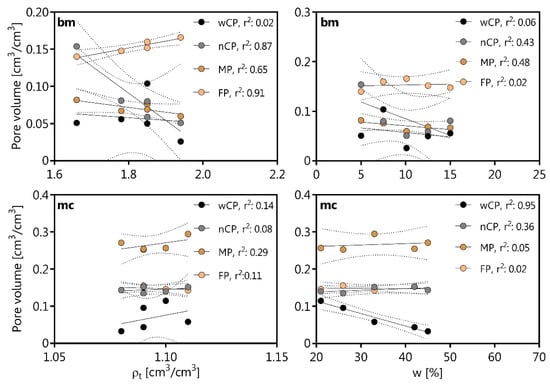 The linear regression analysis of the pore sizes of bm and mc with the bulk density (ρt) and the water content (w) during the Proctor test. Therefore, the nCP (r2: 0.87), MP (r2: 0.65), and FP (r2: 0.91) correlated positive to the ρt values of bm, while the wCP correlated positive to w (%) of mc with r2 of 0.95 (Figure 3).