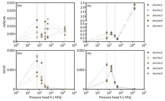In general, the observed and pore size distribution correspondent shrinkage-induced volume change of bm was considerably lower than that of mc. The first structure peak is very distinct, and therefore the shrinkage-dependent volume change of bm1–bm5 (Figure 4), while the water loss between −60 and −300 hPa is not as significant for the volume change, except for bm1. The second matric peak and the corresponding volume change is more pronounced the higher the water loss within −300 and −15,000 hPa. For bm1, there is no significant volume change in the FP range (<−15,000 hPa), while the volume change of bm2−bm3 is less pronounced for the FP than for MP; the opposite trend has been observed for bm4−bm5 corresponding to the increased initial water content.