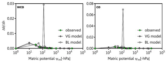 In result, the bi-peak structure of co is more pronounced than of wco and the SWRCs describe that an emptying of structural pores here denoted as wCP (>−60 hPa) and textural pores denoted as nCP (−60 to −300 hPa) leads to a pronounced water loss. There are also more pronounced differences between the observed data and the VG model than with the BL model (Table 14).