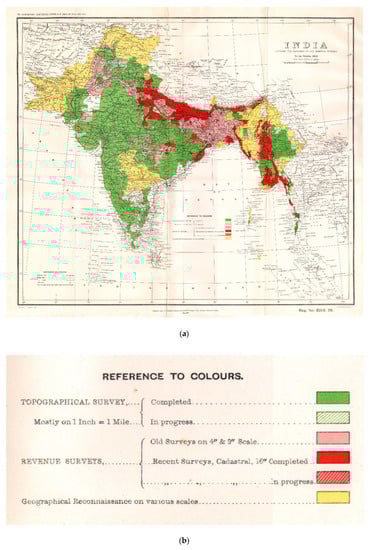The history of the Survey of India is a rich vein for scholarly enquiry, particularly as it was extensively documented [,,,,]. Beyond consideration of its contribution to geodesy and cartography, it is ripe for the deconstruction of imperial ideology, the political impact of map making, and the conception of borders and frontiers [,,,]. Most scholarly attention has been directed to the period before 1843, which Edney [], also [] has referred to as a phase of “cartographic anarchy”, when colonial surveyors struggled with the practical complications and epistemological challenges of surveying such extensive and (geographically and culturally) complex territory. In contrast, the period from 1843 to 1904 is regarded as one of consolidation and comprehensive survey [,,], which was marked by progressive expansion of the territory controlled by the colonial authorities and the implementation of measures to systematically document the subcontinent district by district (see above).