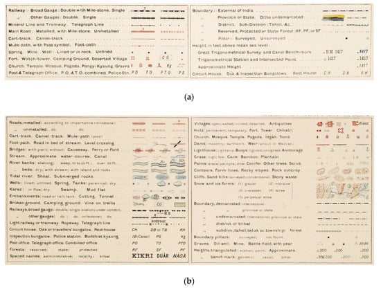 The production of these maps in the early twentieth century occurred on the back of the topographic surveys that had started over 50 years before, and whose execution was documented in two editions of The Manual of Surveying in India [,]. The importance of these maps for both administrative and military purposes meant that specific guidance was given for the types of features that were essential to document, particularly rivers, streams, canals, populated areas, roads and areas suitable for military camps or positions ([], pp. 441–448). As Thuillier and Smyth ([], p. 281) noted “The conspicuous objects and all geographical items thus laid down, but all the different descriptions of land separated, viz. cultivation, waste, fallow, sites of villages and land fit for cultivation, the area of which being required for settlement purposes, is found by triangulation on the map”. The geographical and topographic features were supposed to be documented using the same system and/or a consistent set of principles, and reference was made to a number of core European military surveying manuals ([], p. 285).