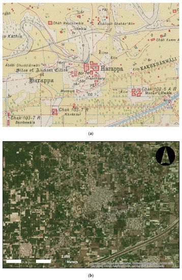 (a) Detail showing documentation of the “Sites of Ancient Cities of Harappa”, including depiction of mounds delineated by ‘form-lines’, graves, and ‘x’ signifying deserted villages, and their relationship to the modern town (44/B14/1933) (Image courtesy of Cambridge University Library); (b) ESRI world imagery of the same region today.