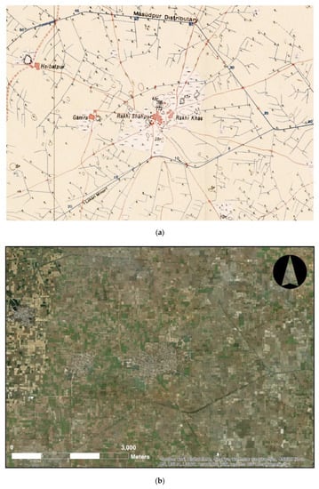 There was some general awareness amongst the surveyors of the Survey of India of major archaeological sites, as the Survey of India 1” to 1-mile series maps document the archaeological sites that had been documented by the Archaeological Survey of India and/or were known at the time of the production of the maps of the during the early decades of the twentieth century. There appears to have been a consistent approach to the symbology that was used to depict the mound sites, which was presumably a result of the actions of the Committee of 1905–06. There was, however, a degree of evolution in the way that legends were depicted, with specific differences evident in maps from 1915 (Figure 4a) and those from 1936 (Figure 4b), where ‘Antiquities’ are indicated at the top right of the latter. These same differences are evident in the legends of the Ordnance Survey maps from the same period. Such sites are indicated on the maps through the use of gothic script (e.g., Harapâ [], pp. 105–108); Sites of Ancient Cities of Harappa, 44/B14/1936; Figure 5a), which is again something that appears in Ordnance Survey maps of the same period and up to the present. Furthermore, archaeological sites are mentioned in a number of District Gazetteers, and the Director General of the ASI and other subordinates are thanked for providing relevant information []. Significantly, the well-known archaeological sites that were comprised of elevated mounds were not typically depicted through the use of contours, but through the use of ‘form-lines’, which are ‘lines drawn on a map to indicate the estimated configuration or elevation between the contour lines’ (Oxford English Dictionary) (Figure 5a). Furthermore, elevated mounds that were not then known as archaeological sites, including the major Indus Civilisation city of Rakhigarhi, were also documented using ‘form lines’ (Figure 6a). Although there has been considerable development adjacent to both sites, they are still visible in modern satellite photos (Figure 5b and Figure 6b).