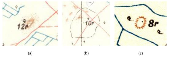 (b) ‘form-line mound features’, which were delineated using a discontinuous horizontal brown or black line (Figure 8b) that was usually employed for medium size (2) and large size (3) mounds. The use of discontinuous ‘form-lines’ indicates that they represent clear areas of elevation. The use of the horizontal rather than vertical lines to depict elevation is potentially related to the shallowness of the slope. It is likely that the form-lines were used as break-lines marking the transition between the flat plain and the elevated mound. The presence of a spot height presumably marks the highest point of the mound. In the process of hill-sketching, Surveyors were advised to use 25 feet contours ([], p. 557), so an elevation of up to 7.5 m would have only warranted one contour. The choice to use form lines rather than contours to depict such mounds is interesting, as it suggests that they were recognised as not being natural hills, but there are no clear references to methods for depicting such features in either edition of A Manual of Surveying for India [,];