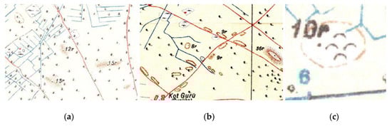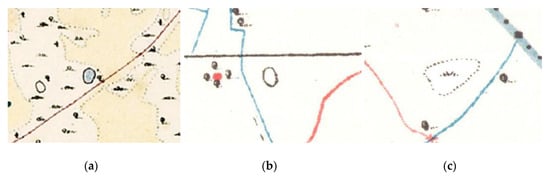 The use of continuous black lines to demarcate small features can be confusing, but it appears that these typically represent ponds (Figure 10a,b). When ponds contained water they were coloured blue (Figure 10a), while those that were dry at the time of survey were represented as a continuous black line without a colour fill (Figure 10b). Lines formed of points also appear, and appear to represent areas under cultivation (Figure 10c, also Figure 10a).