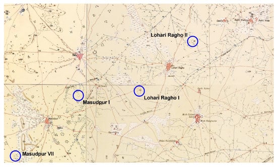 The Survey of India 1” to 1-mile (1:63,360 scale) map series originated in a very specific imperial context [], and were based on surveys carried out from the mid–late nineteenth century onwards. These surveys were started in the wake of the conquest of Punjab and the then North-West Frontier Province and the Indian rebellion of 1857, which is also known as the First War of Independence. The resulting maps were published from the early twentieth century onward as part of series that were issued progressively and updated incrementally, and they were primarily designed to present information that was relevant to the military, such as the location of villages, roads, irrigation canals and the nature of land-use []. The surveys and the maps they produced also incidentally documented the locations and, to some extent, the height and area, of thousands of elevated mounds that were visible in the landscape at the time that the surveys were carried out. It appears that in most instances the surveyors did not recognise these mounds as anything unusual. A significant proportion of these mounds were actually the remains of ancient settlements, some of which built up during the processes of the formation and abandonment of ancient settlements millennia ago.