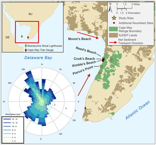 A primary driver of shoreline response is the incident wave record that establishes the net direction and magnitude of inshore sediment transport. Whereas there is no long-term record of the waves present along these three estuarine locations in Delaware Bay, a wind record does exist at a buoy located in the bay [28] (Figure 2). These data indicate major wind directions are from the northwest and from the southwest, thereby having considerable effect on the New Jersey side of Delaware Bay. However, the southwest winds (and associated waves and currents from the southwest) are dominant at the study sites because of the sheltering effect of the landmass to the north of the three sites. The result is a net dominant flow and alongshore transport to the north at Pierce’s Point and Reed’s Beach, and a net dominant flow and alongshore transport to the east at Moore’s Beach. Furthermore, the restricted-fetch environment limits the potential for incident waves to interact with the offshore sediments, thereby reducing the opportunity for cross-shore transport [29,30,31,32]. The result is a relative concentration of sediment transport along the beach face and nearshore by alongshore processes and interaction with natural and anthropogenic features in the vicinity of the shoreline.