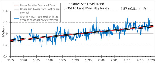 - NOAA Tides and Currents. Relative Sea Level Trend 8536110 Cape May, New Jersey. National Ocean Service, Center for Operational Oceanographic Products and Services; 2018. Available online: https://tidesandcurrents.noaa.gov/sltrends/sltrends_station.shtml?id=8536110 (accessed on 20 October 2018).
