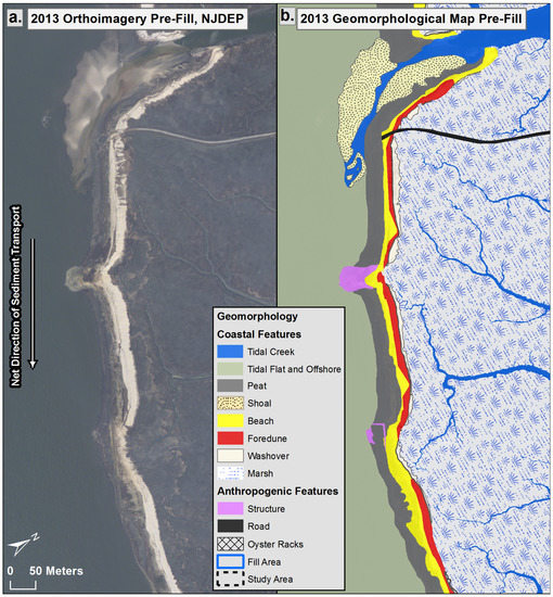 (a) 2013 Pre-Fill orthoimagery of Pierce’s Point from the New Jersey Department of Environmental Protection (NJDEP) [36]. Beach nourishment was accomplished to the north of the housing for an alongshore distance of 360 m. (b) Geomorphological map of the Pierce’s Point site prior to placement of sand on the beach, based on air photo interpretation of (a) together with field validation carried out in 2017. Features incorporate the inland displacement of the beach, dune, and washover fans migrating over the wetland to the interior and causing peat to be exposed in the beach zone.
