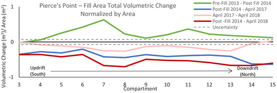 Volumetric change normalized by compartment area within the fill area at Pierce’s Point. Values between the two grey dashed lines fall within the uncertainty calculation.