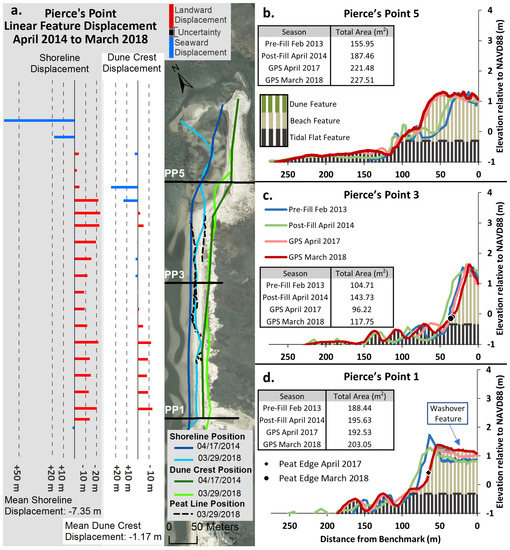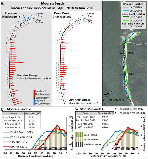 Shoreline position displacement and dune crestline displacement in the area of fill, with the exception of the tidal creek at the western margin of the site, had a landward displacement (Figure 17a). The maximum inland shoreline displacement was −40 m in the vicinity of several exposed building foundations in the center of the site. Inland shoreline displacement was also large downdrift of foundation ruins in the eastern portion of the site. The mean displacement was −12.78 m from April 2014 to June 2018 throughout the study area. Several edges of peat layers were exposed in the beach face in 2018 along all of the study area except at the western tidal creek.