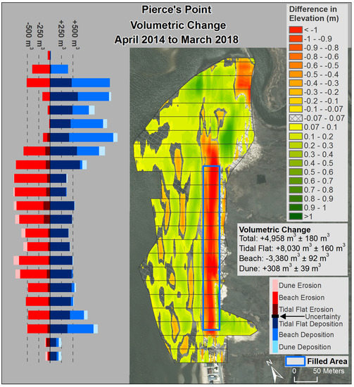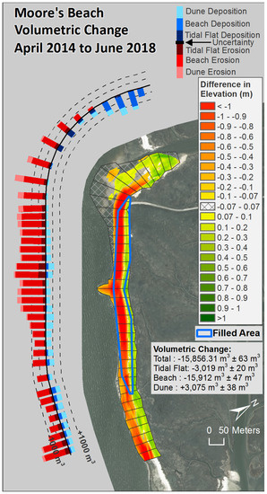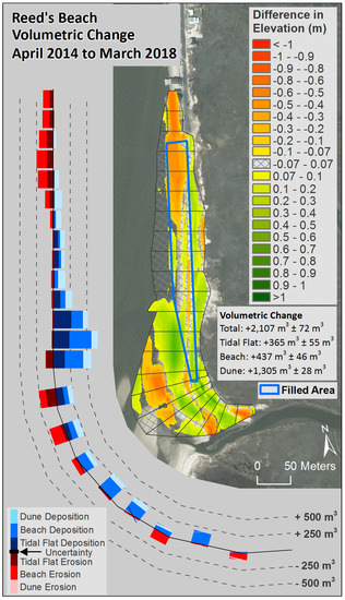 The comparison of the DEM from post-fill, March 2014, to the DEM from March 2018 (Figure 15, Table 2) depicts the modification of the sediment emplaced on the beach and gives a metric of sediment budget for the entire site and for the geomorphological features present in the alongshore compartments as well as for the entire site. In the northern 150 m of the site, the fill had been totally removed with some gains in the dune feature. The middle 120 m of the site had modest change with accumulation in the beach, dune, and tidal flat, with much of the area having elevation changes less than the value of uncertainty (±0.07 m). The greatest change was in the southern 120 m of the fill zone, where the tidal flat and the beach had gains of more than 200 m3 in each of three compartments. South of the fill location, there was loss in the tidal flat and beach as well as gain in the beach and dune. This was an area associated with the creek and the shoals at the mouth of the creek and it was also an area that was adjacent to the nourished beaches located to the south. There was a net gain of sediment in the study site over the post-fill period, 2107 m3 ± 72 m3, in the combined tidal flat, beach, and dune, with the dune feature gaining more than half of the total. The total net gain was nearly 6% greater than the amount of sediment recorded in the post-fill survey. Volumes within the geomorphological features by survey and by Compartment are compiled in Supplementary Data (Tables S4–S6).