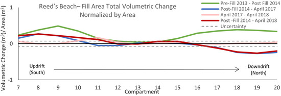 Volumetric change normalized by compartment area within the fill area at Reed’s Beach. Values between the two grey dashed lines fall within the uncertainty calculation.