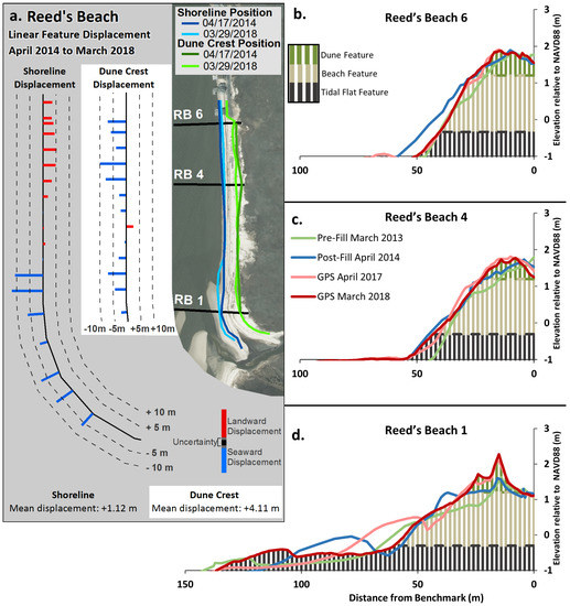 (a) Linear displacement of shoreline position and dune crestline, April 2014–March 2018. Shoreline and dune crest position extracted from survey datasets and the location of selected profiles. 2015 orthoimagery [42]. (b–d) Selected profiles February 2013–March 2018.