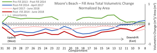 The entire length of the study area at this site consisted of 39 compartments. However, sediment placement via beach nourishment in the fill area was restricted to Compartments 8–31 (Figure 16). The amount of sediment placed in each compartment during the 2013–2014 period and the areas of the compartments varied, especially at the margins. To compensate for this variation, the units of initial accumulation and subsequent change are expressed in m3 per m2 of the referenced Compartment. Furthermore, the metrics of fill refer to the volumes present in the fill area in April 2014 compared to the pre-fill survey in February 2013. Initially, the fill was placed in Compartments 20–31. Later, fill was placed in Compartments 8–19, with a gap between the two deposits. The western portion of the fill had similar amounts across the compartments, whereas the eastern portion had a major node in Compartments 13–14 grading to small amounts in the downdrift margin of the fill area. The comparison of the volumes calculated in Spring 2014 to the results from the next survey in April 2017 showed a loss in each of the Compartments except for the most downdrift unit of the fill area, Compartments 8–9. The next annual period, April 2017–June 2018, recorded a continuation of the removal of the emplaced sediment, with losses of a similar magnitude across the entire fill area. Over the period from the post-fill survey to June 2018, the entirety of the April 2014 accumulation of 6980 m3 ± 78 m3 in the fill area had been eroded, with losses decreasing toward the downdrift margin of the fill area, a net loss of 12,426 m3 ± 67 m3.