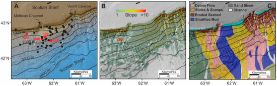 The study area is located on the western central Scotian Slope (43°00′ to 42°18′ N latitude, 62°30′ to 60°30′ W longitude; Figure 2) in water depths from 500 to 2500 m (Figure 1 and Figure 2). The area is bounded on the west by the Mohican Channel and on the east by the Verrill Canyon. The shelf break lies 400–500 m below sea level (mbsl). The slope is initially steep (~4°) and becomes more gradual with depth (Figure 2B) (see Mosher et al. [33] for a detailed analysis on the slope morphology). The morphologies of the central Scotia Slope are smooth relative to its eastern portion that is heavily incised by canyons (Figure 2). The seabed is cut by shallow, downslope-trending gullies that begin at about 500 mbsl.