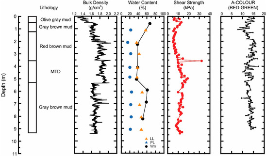 In addition to the MST data, discrete constant volume samples were extracted for index property measurements at 75 cm intervals and measurements of mini-vane peak undrained shear strength were taken at 10 cm intervals. These data provided vital ground truth to the remotely-sensed MST data. Atterberg limits were determined at various down-core depths depending on lithology and water content measurements. The density, water content, Atterberg limits, shear strength, color, and lithology were combined into geotechnical profiles (Figure 3).