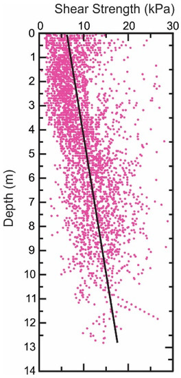 The factor of safety, FS, for each core and at each depth, z, is calculated using Equation (15) assuming an undrained condition (i.e., φ = 0). Using the deterministic approach, the reported FS is the minimum value found over depth for each core. FS is calculated twice for each core; first using point shear strength measurements and, second, using a “smoothed” dataset of shear strength values averaged over a 0.7 m moving window. The averaging had the effect of removing extremely low values of undrained shear strength (which would likely be average out in the downslope direction in any case), so that the (minimum) FS for the averaged data was in general higher than that found using point values.
