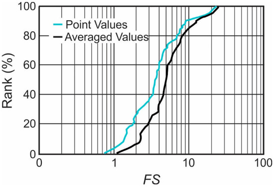 A summary of deterministic FS results is presented in Figure 6, which illustrates that the estimated probability that the FS will be less than unity using the point data is approximately two to four percent, while the FS obtained using the averaged data always remains above 1.0. The averaged FS generally increases by more than about 30% above that obtained using point values.