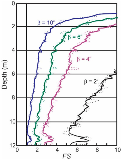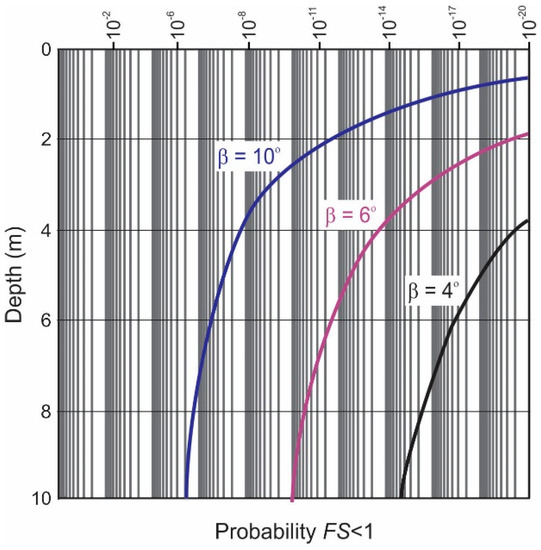The probability of a FS less than one was computed with depth as presented in Figure 9 for varying slope angles. At ten degrees, the curve asymptotes at less than , which is acceptable for offshore foundations.