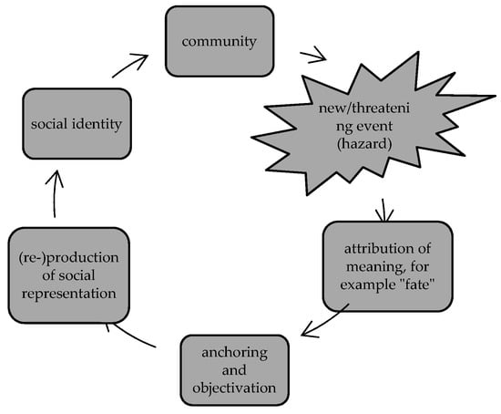 Social representations mirror the manifold meanings, which emerge from the diversity of subjectively and culturally shaped perceptions. Since, according to the individualization thesis [], perceptions, meanings and identities are more and more fragmented and therefore the overlap of commonly shared meanings becomes narrower. Accordingly, lifestyle and social environment are subject to choice from a broad set of options. Since individuals internalize many representations in mixed contexts, there can be a certain variety of different meanings within a community []. For instance, the same hazard event in a village does not necessarily have the same meaning for all residents but there is one meaning that is the norm from which others deviate.