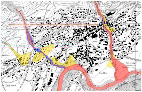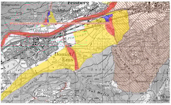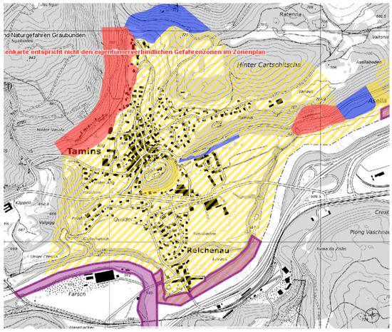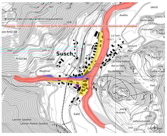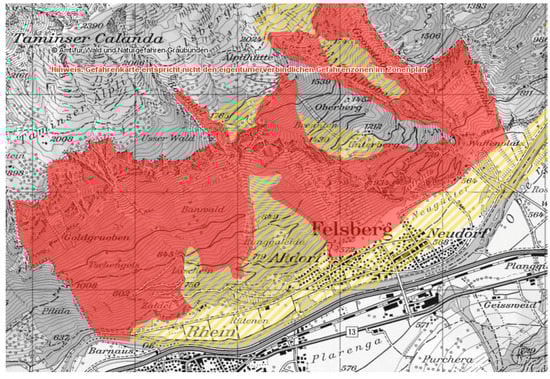 Felsberg is located close to the Calanda limestone rock wall (Figure 2 and Figure 3). After a famous event in 1834, rock falls were subsequently systematically documented. Until 2002, around 50 events were counted []. In 2001, the last major event occurred when 250,000 cubic metres of material fell down but did not threaten lives or homes. Within the last decade, floods caused by the river Rhine took place in 2005 and 2009. The whole area of the community lies in the yellow-white rock fall risk zone and the northern community border is located close to the red zone.