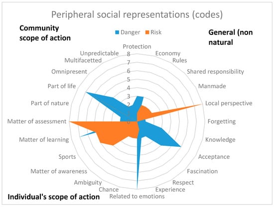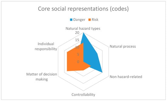 This part of the interview was transcribed according to a content analysis approach []. Based on these transcripts, codes of social representations were derived from interviews in each community. The results focus on social representations. These are compared and discussed in Section 4 of this article. We did additional comparison with the social representations of “danger”, since differences in the understanding of both terms are relevant for the practice of risk communication.