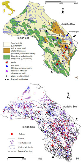 - Cotecchia, V. Area Idrogeologica del Salento. In Memorie Descrittive Della Carta Geologica d’Italia; ISPRA—Istituto Superiore per la Protezione e la Ricerca Ambientale: Rome, Italy, 2017; Volume 92, pp. 312–442. [Google Scholar]