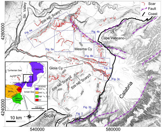 Shaded relief map (azimuthal light) of the Calabro–Tyrrhenian continental margin encompassed between Cape Vaticano and the Messina Strait (location in the inset), with the indication of the recognized landslide scars (red lines from [15]), the main faults (violet lines from [16]) and the location of the following figures (blue boxes). The inset shows a simplified structural sketch of Southern Italy (modified from [17]); KCC: Kabilo–Calabride Chain Units; AMC: Appennine–Maghrebian Chain Units; PBF: Pelagian Block Foreland Units; QV: Quaternary Volcanoes; 1 regional overthrust of the Kabilo–Calabride units upon the Apennine–Maghrebian; 2 external front of the Apennine–Maghrebian Chain upon the Foreland units and the External Thrust System Chain; 3 main normal and strike–slip faults.