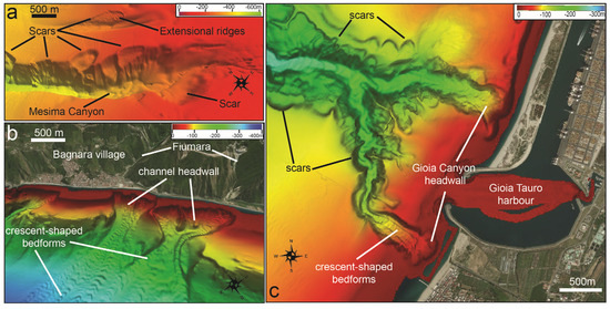 In the study area, a main canyon–channel system is formed by the Gioia and Mesima shelf–indenting canyons (Figure 1 and Figure 3; [13,26]). Minor channels are also recognizable, such as the Bagnara Channels in the southern part (Figure 1 and Figure 3b). Landslide scars are largely recognizable both at the headwall and flanks of the Gioia–Mesima canyon–channel system, commonly showing a semicircular and regular shape (Figure 3). Differently, morphological evidence of clear deposits associated with landslide deposits is often lacking on the multibeam bathymetry. Landslide scars occurring along the canyon flanks generally have a larger size (diameters ranging from few hundreds of meters up to ≈1000 m; Figure 3a and c and Table 1) with respect to the canyon headwall. These scars are often coalescent and nested with each other, forming a linear to sinuous array of instability features following the main path of the canyon. In some cases, extensional ridges and detached blocks are recognizable within the landslide scars located in the upper (or external) part of the canyon flanks (Figure 3a), indicating that the mobilized material was not totally evacuated during the failure event.